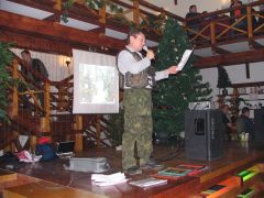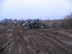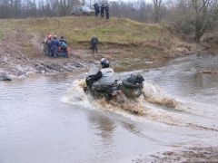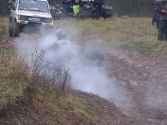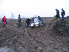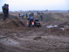 Но наш проводник всё-таки знал своё дело. Миновав какие-то подозрительные фермы, окруженные морями жидкой грязи, почти такой же, как в телевизионных соревнованиях по борьбе, мы всё же вырулили к стрельбищу, расположенному в заброшенном карьере. Но тут уж наш экипаж сплоховал. Лёха случайно завернул не на ту тропинку, и мы, обогнув карьер и полюбовавшись сверху на стреляющих, вместо того чтобы обнаружить спуск к ним, углубились в какую-то помойку, простирающуюся до горизонта. А когда поняли, что заехали не туда куда надо, то увидели, что грязь на дороге даже следов не сохраняет, и вообще теперь непонятно, куда ехать. Положение спас «звонок друга», благо сотовая сеть везде работает: руководитель группы, обеспокоенный долгим отсутствием своих подопечных, подсказывает дорогу. Узнав правильный путь, через десять минут мы уже на стрельбище. Стрельбы из охотничьего оружия - это фирменное развлечение Чёрных Медведей, которое тоже стало традиционным для Шатуна. Суть соревнований в том, что участники делают одинаковое количество выстрелов каждый по своей мишени, и у кого после этого в ней окажется большее число дырок от дроби, тот и молодец! Приятно побабахать в сумрачном осеннем лесу. Выезд со стрельбища несёт в себе дополнительное развлечение, не все берут подъём с первого раза, опять толкают друг друга и говорят добрые русские слова. Когда утром мы выезжали из Берлоги, то предполагали, что по ходу маршрута будем периодически меняться за рулём. Но потом стало ясно, что «коней на переправе не меняют», и пусть уж Лёха, «присидевшийся» за рулём, бьётся до конца. Взамен я обещаю ему назавтра везти до самой Москвы, дав возможность отдохнуть в люле. А покуда я остаюсь в ней сам, но на бездорожье отдыхом это назвать никак нельзя! Брод-Шоу