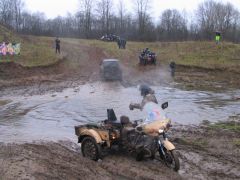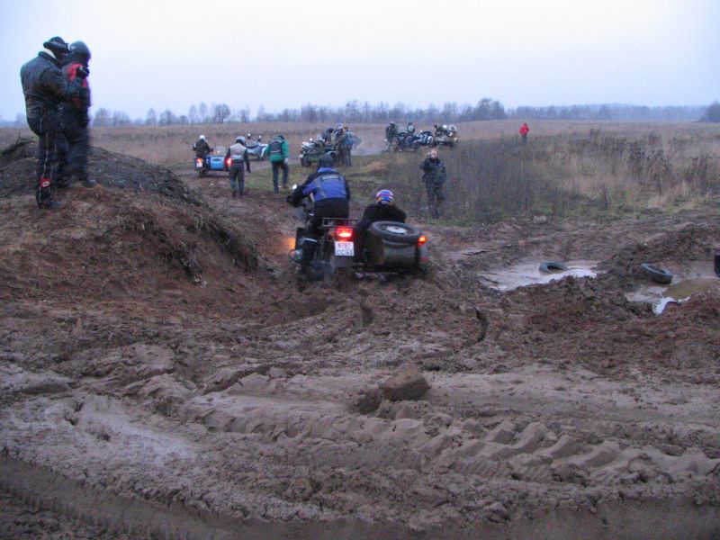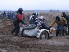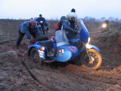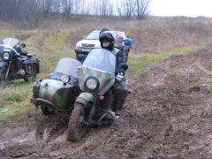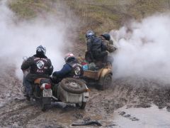 Про наш приводной «Урал» Gear-Up и писать-то особенно нечего. Лёха заблаговременно подключил привод и проехал через грязь наискосок с улыбкой на лице. Нужно заметить, что и другие мотоциклы, оснащённые этим полезным девайсом, чрезмерных трудностей не испытали. Воистину, привод на коляску - гениальное изобретение!