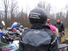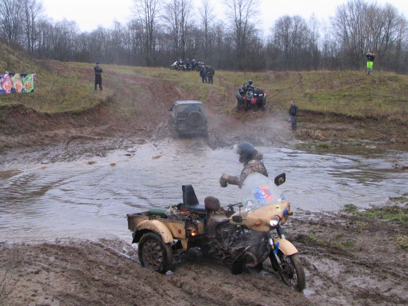Был у Брод-Шоу и свой герой, который на БМВ R1200GS с коляской преодолел брод трижды. То есть после первого раза ему понравилось, и он решил вернуться и повторить. Бумер, оснащённый злобной питерской резиной, без труда справился с задачей. Наш «Урал» Крокодил тоже не подвёл. Крузенштерн долго ждал, когда же освободится правый выезд на берег, но там постоянно кто-то крепко сидел; тогда Лёха попросту объехал сражающихся, и тупо в лоб взял подъём с грязищей и недоброкачественным уклоном. И наверху, заглушив мотор, докурил сигаретку, которую так и не выпустил изо рта во время штурма. Угощение