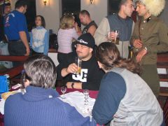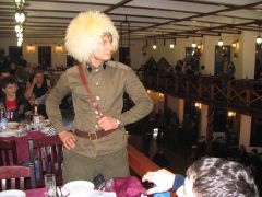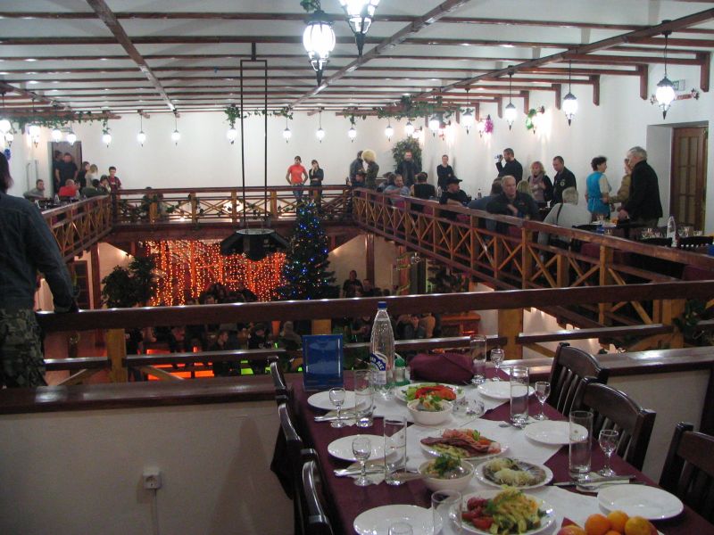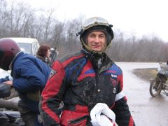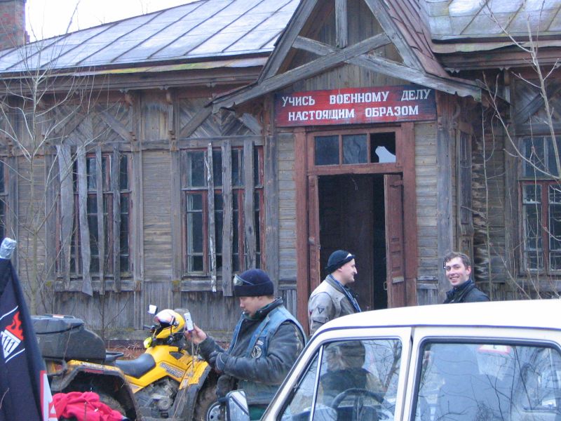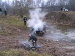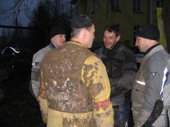 Миновав несколько прохватов по пампасам и асфальтовых участков, мы добираемся до Карабихи и подъезжаем к старинному саду, в глубине которого виден большой дом. Юра останавливает колонну и сообщает, что это - усадьба великого русского поэта Некрасова. Смотрим с любопытством, но заходить внутрь в том виде, в каком мы сейчас находимся, было бы немыслимо. М-да... Надо будет сюда заехать в более благоприятное время года... А покуда наша группа устремляется к месту обеда, которое совсем недалеко от некрасовского имения. Тем более что день уже клонится к закату, а темнота в декабре наступает рано. Обед у Чёрных Медведей - это всегда нечто серьёзное. Вот и на этот раз каждый получил тарелку мясного супа, в котором собственно мяса было больше, чем всего остального. Ну, плюс к тому пирожок, чай и всё такое. Несмотря на целый день продубаса на открытом воздухе и соответствующий ситуации аппетит, голодным никто не остался. Володя Стингер, заведующий раздачей, настойчиво предлагал всем добавки, но желающих получить её было не так уж много. Вот что значит настоящий медвежий обед! Все присутствующие, в общем-то, не отличались безупречной чистотой одежд, но некоторые из них обратили на себя внимание ещё и резким запахом, исходящим от их мотоциклов и экипировки. Заинтересовавшись феноменом, я выяснил, что группа эндуристов на одном из полей по маршруту на скорости влетела в исполинскую кучу навоза диаметром в добрую сотню метров. И глубиной по пояс. С виду куча не отличалась от обычного скопления грязи, а когда различили по запаху, было уже поздно. Кому-то посчастливилось взять её с ходу, но некоторые имели несчастье упасть... Те, кто попытался прийти им на помощь, тоже оказались по уши в... сами понимаете, чём. Кто там хихикает? Не смешно! Это вам не борьба в ванне с грязью!