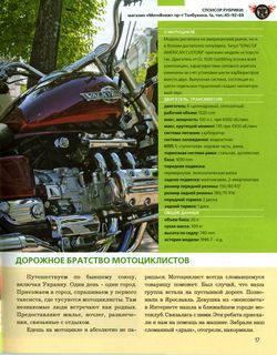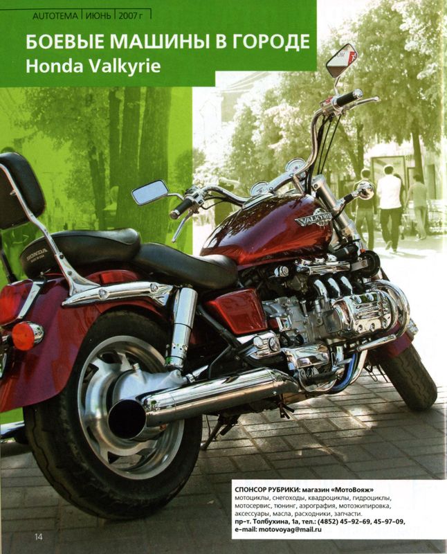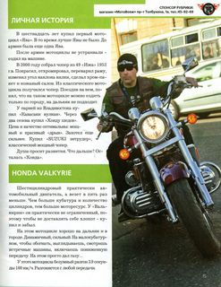AUTOТЕМА №3 Июнь 2007г. тираж 5000 экз БОЕВЫЕ МАШИНЫ В ГОРОДЕ Honda Valkyrie ЛИЧНАЯ ИСТОРИЯ В шестнадцать лет купил первый мотоцикл «Ява». В то время лучше Явы не было. До армии была еще одна Ява. После армии мотоциклы не устраивали - ездил на машине. В 2000 году собрал чопер из 49 «Ижа» 1953 г.в. Покрасил, отхромировал, переварил раму, изменил угол наклона вилки, сделал хром-пакет и кожаный салон. Из классического мото цикла получился чопер. Поездив на нем, понял, что на таком мотоцикле можно ездить только по городу, на дальняк не подходит. У парней из Владивостока купил «Кавасаки вулкан». Через два сезона купил «Хонду шедов». Цена и качество оптимальны: мощный и красивый «дрын». Захотел еще сильнее. Купил «SUZUKI энтрудер», классический мощный чопер. Душа просит развития. Что дальше? Осталась «Хонда». HONDA VALKYRIE Шестицилиндровый практически автомобильный двигатель, а везет в пять раз меньше. Чем больше кубатура и количество цилиндров, тем больше моторесурс. У «Валькирии» он практически не ограниченный, поэтому чтобы не доставлять себе хлопот - купил и забыл. На этом мотоцикле хорошо на дальняк и в городе. Динамичный, сильный. На малокубатурном, чтобы обогнать, выглядываешь, смотришь встречные машины, включаешь пониженную передачу. На этом просто дал газу... У этого мотоцикла безумный разгон 3.9 секунды 100 км/ч. Разгоняется с любой передачи. О ЧЕМ МЕЧТАЮТ «МЕДВЕДИ»? Построить большой club-house с хорошей ремонтной зоной, с местом для отдыха, рестораном, в котором встречали братьев-мотоциклистов со всей России. Посмотреть дороги, попутешествовать. Когда были слабокубатурные мотоциклы, мечтали о ближней и дальней загранице. Сейчас многое становится реальней, двое наших членов клуба заряжены на кругосветку. Другие собираются в Португалию на всемирный мотофестиваль «Honda goldwin». ПОЧЕМУ КЛУБ НЕ ДЛЯ ВСЕХ Не принимаем наркоманов и пьяниц. На улице такой человек может представлять опасность, на мотоцикле эта «опасность» будет быстро передвигаться. Не принимаем женщин. Потому что при возникновении жесткой ситуации, когда за день нужно проехать 1000 км и больше, девушки не справляются с такой нагрузкой. Пусть лучше обозом едут. При клубе у нас сложился «женсовет». Девушки ездят с нами на мероприятия, помогают приготовить еду. Встречают уставших мотоциклистов водочкой и огурчиком, в общем делают радостнее суровые будни мотоциклистов. Наш клуб это большая семья. К нам приходят не для реализации своих корыстных интересов, а желая чем-то поделиться, внеся свой вклад в развитие клуба. О МОТОЦИКЛЕ Модель рэсчитана на американский рынок, но и в Японии достаточно популярна. Титул "KING OF AMERICAN CUSTOM" присвоен модели не порсто так. Двигатель от GL1500 GoldWing основа всей композиции, характеристики силового агрегата изменены за счет установки шести карбюраторов вместо двух. Выпускная система, состоящая из шести отдельных глушителей создает неповторимый звук. ДВИГАТЕЛЬ, ТРАНСМИССИЯ ОБЩИЕ ДАННЫЕ ДОРОЖНОЕ БРАТСТВО МОТОЦИКЛИСТОВ Путешествуем по бывшему союзу, включая Украину. Один день - один город. Приезжаем в город, спрашиваем у первого таксиста, где тусуются мотоциклисты. Там незнакомые люди встречают как родных. Предоставляют жилье, ночлег, развлечения, связанные с отдыхом. Едешь на мотоцикле и абсолютно не паришься. Мотоциклист всегда сломавшемуся товарищу поможет. Был случай, что наша группа
