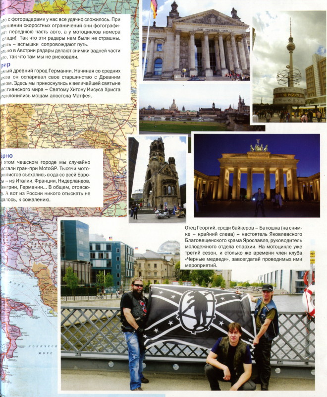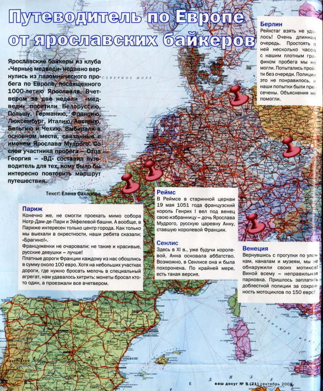 "Ваш Досуг" №9 Сентябрь 2008г. тираж 5000 экз Путеводитель по Европе от ярославских байкеров Ярославские байкеры из клуба «Черные медведи» недавно вернулись из паломнического пробега по Европе, посвященного 1000-летию Ярославля. Вчетвером за две недели «медведи» посетили Белоруссию, Польшу, Германию, Францию, Люксенбург, Италию, Австрию, Бельгию и Чехию. Выбирали в основном места, связанные с именем Ярослава Мудрого. Со слов участника npoбега - Отца Георгия - «ВД» составил путеводитель для тех, кому было бы интересно повторить маршрут путешествия. Париж Конечно же, не смогли проехать мимо собора Нотр-Дам-де-Пари и Эйфелевой башни. А вообще, в Париже интересен только центр города. Как только мы выехали в окрестности, наши ребята сказали: «Брагино!». Француженки не очаровали: не такие и красивые, русские девушки - лучше! Платные дороги Франции каждому из нас обошлись в сумму около 100 евро. Хотя на небольших участках дороги, где нужно бросать мелочь в специальный агрегат, нам удавалось хитрить: монеты бросал кто-то один, а проезжали все вчетвером. Берлин Рейхстаг взять не удалось! Очень длинная очередь. Простоять в ней несколько часов с нашим плотным графиком пробега мы не могли. Попытались пройти без очереди. Полиции это не понравилось, и наши попытки были пре сечены. Объяснения не помогли. Зато с фоторадарами у нас все удачно сложилось. При нарушении скоростных ограничений они фотографируют переднюю часть авто, а у мотоциклов номера сзади! Так что эти радары нам были не страшны. Едешь - вспышки сопровождают путь. Только в Австрии радары делают снимки задней части авто, так что там мы не рисковали. Реймс В Реймсе в старинной церкви 19 мая 1051 года французский король Генрих I вел под венец свою избранницу - дочь Ярослава Мудрого, русскую царевну Анну, ставшую королевой Франции. Сенлис Здесь в XI в., уже будучи королевой, Анна основала аббатство. Возможно, в Сенлисе она и была похоронена. По крайней мере, есть такая версия. Венеция Вернувшись с прогулки по улочкам, каналам и музеям, мы не обнаружили своих мотиков! Виной всему - неправильная парковка. Пришлось заплатить доблестной полиции за сохранность мотоциклов по 150 евро! Трир Самый древний город Германии. Начиная со средних веков он оспаривал свое старшинство с Древним Римом. Здесь мы прикоснулись к величайшей святыне христианского мира - Святому Хитону Иисуса Христа и поклонились мощам апостола Матфея. Брно В этом чешском городе мы случайно застали гран-при MotoGP. Тысячи мотоциклистов съехались сюда со всей Европы - из Италии, Франции, Нидерландов, Венгрии, Германии... В общем, отовсюду. А вот из России никого отыскать не цапось, к сожалению. Отец Георгий, среди байкеров - Батюшка (на снимке - крайний слева) - настоятель Яковлевского Благовещенского храма Ярославля, руководитель молодежного отдела епархии. На мотоцикле уже третий сезон, и столько же времени член клуба «Черные медведи», завсегдатай проводимых ими мероприятий. ![]() ![]() Обсудить в форуме |