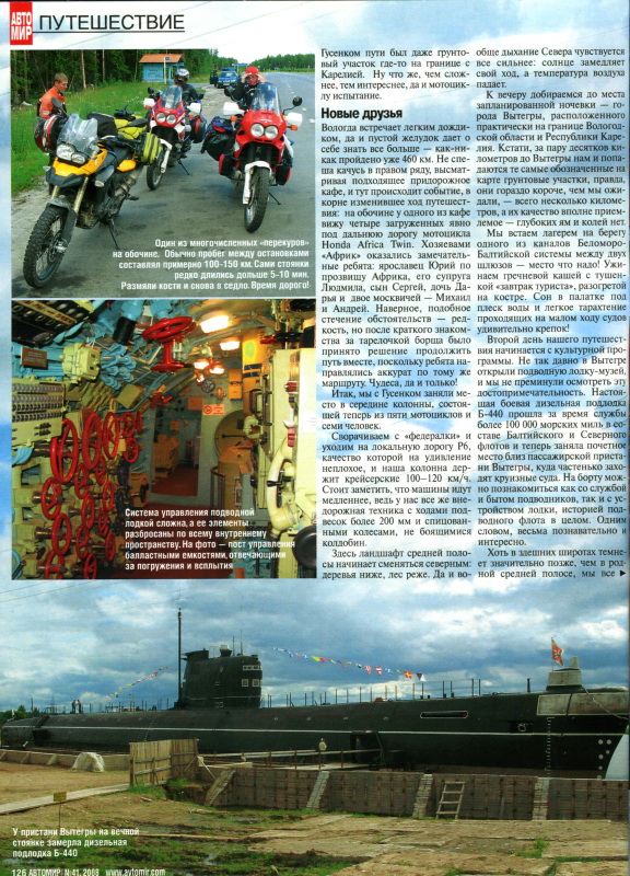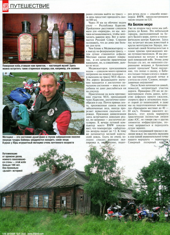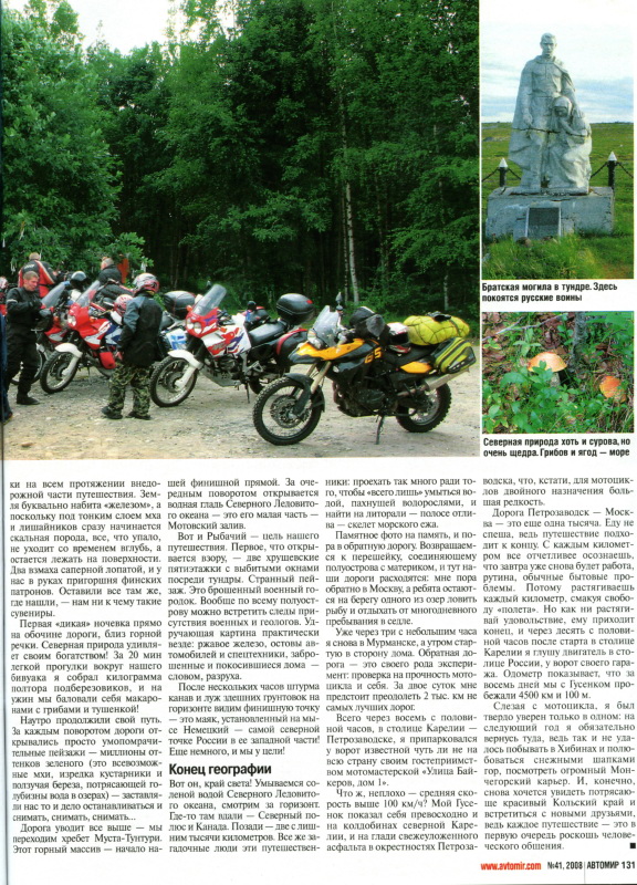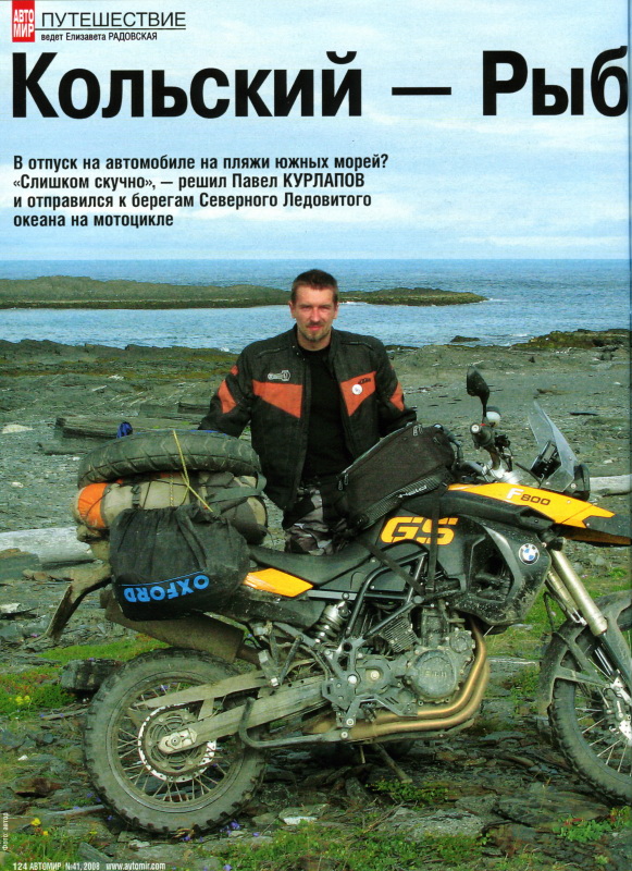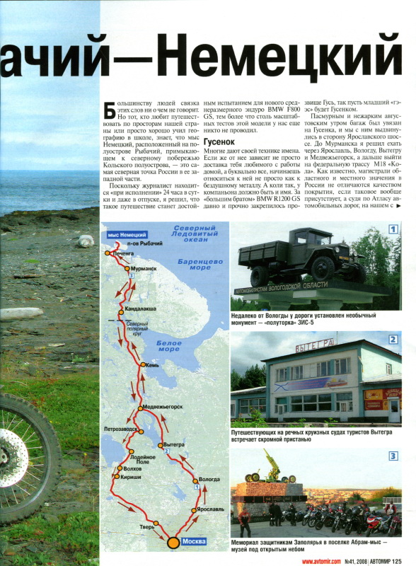"АвтоМир" №41 04.10.2008 Кольский - Рыбачий - Немецкий В отпуск на автомобиле на пляжи южных морей? «Слишком скучно», - решил Павел КУРЛАПОВ и отправился к берегам Северного Ледовитого океана на мотоцикле Большинству людей связка этих слов ни о чем не говорит. Но тот, кто любит путешествовать по просторам нашей страны или просто хорошо учил географию в школе, знает, что мыс Немецкий, расположенный на полуострове Рыбачий, примыкающем к северному побережью Кольского полуострова, — это самая северная точка России в ее западной части. Поскольку журналист находится «при исполнении» 24 часа в сутки и даже в отпуске, я решил, что такое путешествие станет достойным испытанием для нового среднеразмерного эндуро BMW F800 GS, тем более что столь масштабных тестов этой модели у нас еше никто не проводил. Гусенок Многие дают своей технике имена. Если же от нее зависит не просто доставка тебя любимого с работы домой, а букватьно все, начинаешь относиться к ней не просто как к бездушному металлу. А коли так, у компаньона должно быть и имя. За «большим братом» BMW R1200 GS давно и прочно закрепилось прозвише Гусь, так пусть младший «гэ-эс» будет Гусенком. Пасмурным и нежарким августовским утром багаж был увязан на Гусенка, и мы с ним выдвинулись в сторону Ярославского шоссе. До Мурманска я решил ехать через Ярославль, Вологду, Вытегру и Медвежьегорск, а дальше выйти на федеральную трассу М18 «Кола». Как известно, магистрали областного и местного значения в России не отличаются качеством покрытия, если таковое вообще присутствует, а судя по Атласу автомобильных дорог, на нашем с Гусенком пути был даже фунтовый участок где-то на границе с Карелией. Ну что же, чем сложнее, тем интереснее, да и мотоциклу испытание. Новые друзья Вологда встречает легким дождиком, да и пустой желудок дает о себе знать все больше — как-никак пройдено уже 460 км. Не спеша качусь в правом ряду, высматривая подходящее придорожное кафе, и тут происходит событие, в корне изменившее ход путешествия: на обочине у одного из кафе вижу четыре загруженных явно под дальнюю дорогу мотоцикла Honda Africa Twin. Хозяевами «Африк» оказались замечательные ребята: ярославец Юрий по прозвищу Африка, его супруга Людмила, сын Сергей, дочь Дарья и двое москвичей — Михаил и Андрей. Наверное, подобное стечение обстоятельств — редкость, но после краткого знакомства за тарелочкой борща было принято решение продолжить путь вместе, поскольку ребята направлялись аккурат по тому же маршруту. Чудеса, да и только! Итак, мы с Гусенком заняли место в середине колонны, состоящей теперь из пяти мотоциклов и семи человек. Сворачиваем с «федералки» и уходим на локальную дорогу Р6, качество которой на удивление неплохое, и наша колонна держит крейсерские 100-120 км/ч. Стоит заметить, что машины идут медленнее, ведь у нас все же внедорожная техника с ходами подвесок более 200 мм и спицованными колесами, не боящимися колдобин. Здесь ландшафт средней полосы начинает сменяться северным: деревья ниже, лес реже. Да и вообще дыхание Севера чувствуется все сильнее: солнце замедляет свой ход, а температура воздуха падает. К вечеру добираемся до места запланированной ночевки — города Вытегры, расположенного практически на границе Вологодской области и Республики Карелия. Кстати, за пару десятков километров до Вытегры нам и попадаются те самые обозна