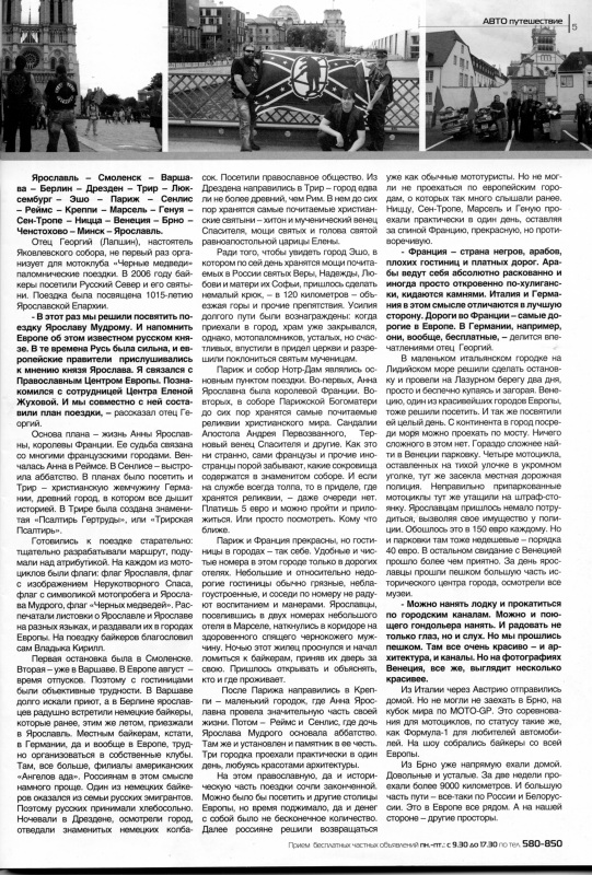 "Авто Magazine" №38(70) 29.09.2008 Семья великого князя К тысячелетию города у нас всяк готовится на свой лад - кто строит новое, а кто и поминает старое. Ярославский мотоклуб «Черные медведи» провел автопробег по Европе. И не для того, чтоб просто покататься, а чтобы вспомнить истоки и напомнить о себе в древних городах континента. Ведь если внимательно читать исторические книги (и вообще, если их читать), Европа для Руси - вовсе не чужой край. ИСТОРИЧЕСКАЯ СПРАВКА Основатель Ярославля, Великий князь Ярослав, которого в скандинавских сагах называли «конунгом Ярицлей-вом», а в русских летописях - «Богомудрым» и «Богохранимым», известен нам с легкой руки Николая Карамзина как Ярослав Мудрый. Мудрую свою политику Ярослав основывал, как принято было в те времена, на семейных связях. А так как правитель был уважаемый, породниться с ним считали за честь многие правящие династии Европы. Женой Ярослава была шведская принцесса Ингигерда, сестру Марию он выдал замуж за короля Польши Казимира, на сестре которого, княжне Гер-руде, женил своего сына Изяслава. Другому сыну, Всеволоду, сосватал заморскую царевну, дочь Константина Мономаха. Дочерей выдал замуж за монархов: Елизавета стала королевой Норвегии, Анастасия - королевой Венгрии, Анна - королевой Франции. Да и внучку Евпраксию не обидел, выдал за германского императора Генриха IV. Ярославль - Смоленск - Варшава - Берлин - Дрезден - Трир - Люксембург - Эшо - Париж - Сенлис - Реймс - Креппи - Марсель - Генуя -Сен-Тропе - Ницца - Венеция - Брно -Ченстохово - Минск - Ярославль. Отец Георгий (Лапшин), настоятель Яковлевского собора, не первый раз организует для мотоклуба «Черные медведи» паломнические поездки. В 2006 году байкеры посетили Русский Север и его святыни. Поездка была посвящена 1015-летию Ярославской Епархии. - В этот раз мы решили посвятить поездку Ярославу Мудрому. И напомнить Европе об этом известном русском князе. В те времена Русь была сильна, и европейские правители прислушивались к мнению князя Ярослава. Я связался с Православным Центром Европы. Познакомился с сотрудницей Центра Еленой Жуховой. И мы совместно с ней составили план поездки, - рассказал отец Георгий. Основа плана - жизнь Анны Ярославны, королевы Франции. Ее судьба связана со многими французскими городами. Венчалась Анна в Реймсе. В Сенлисе - выстроила аббатство. В планах было посетить и Трир - христианскую жемчужину Германии, древний город, в котором все дышит историей. В Трире была создана знаменитая «Псалтирь Гертруды», или «Трирская Псалтирь». Готовились к поездке старательно: тщательно разрабатывали маршрут, подумали над атрибутикой. На каждом из мотоциклов были флаги: флаг Ярославля, флаг с изображением Нерукотворного Спаса, флаг с символикой мотопробега и Ярослава Мудрого, флаг «Черных медведей». Распечатали листовки о Ярославле и Ярославе на разных языках, и раздавали их в городах Европы. На поездку байкеров благословил сам Владыка Кирилл. Первая остановка была в Смоленске. Вторая - уже в Варшаве. В Европе август -время отпусков. Поэтому с гостиницами были объективные трудности. В Варшаве долго искали приют, а в Берлине ярослав-цев радушно встретили немецкие байкеры, которые ранее, этим же летом, приезжали в Ярославль. Местным байкерам, кстати, в Германии, да и вообще в Европе, трудно организоваться в собственные клубы. Там, все больше