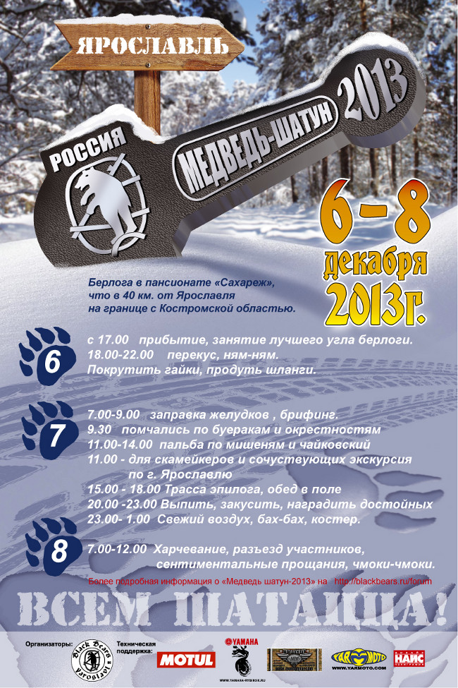 6-8 Декабря 2013г. "Медведь-Шатун" (Black Bears MC) ![]() Стоимость участия и проживания:Участие в Медведе шатуне 2013 - 1650 р. 4х-6ти местные номера с удобствами на этаже (корпуса № 1, 5) с питанием за 2 дня- 2000 р. 4х местные номера с удобствами на этаже (корпус № 2) с питанием за 2 дня - 2200 р. Номера со всеми удобствами (корпуса 3, 4) с питанием за 2 дня В двухместном номере - 3000 р. В одноместном номере - 4000 р.Реквизиты для оплаты:ОАО « Сбербанк России» Номер карты : 5469 7700 1255 7246 Банк получателя : Доп. Офис №17/0117 Кор/счет банка : 30101810500000000670 БИК банк : 047888670 Счет получателя : 40817810077031408747 Ф.И.О. получателя : КАЛАЧЕВ СЕРГЕЙ ЮРЬЕВИЧ При переводе необходимо указать от кого данный перевод, или подтвердить перечисление денежных средств на почту medvedshatun2013@mail.ruДля регистрации на мероприятие необходимо каждому участнику заполнить следующую анкету и отправить на medvedshatun2013@mail.ruФ.И.О: Дорожное имя: Паспортные данные: Марка и номер мотоцикла: Проживание (палатка/номер): Количество мест в номере,какой номер: Экскурсия в г. Ярославль для лиц, не участвующие в гонке (да/нет): Участие в МШ прошлых лет (да/нет): Телефон , e-mail:Телефон для справок +79109692280 |