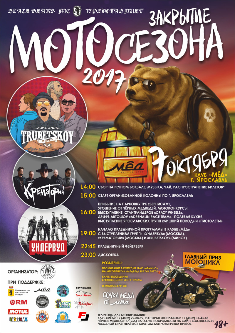 7 Октября 2017г. Закрытие сезона (BBMC Ярославль) Мотоклуб "Чёрные Медведи" приглашает всех на праздничное закрытие мотосезона 2017! Программа праздника: 14.00 Сбор на речном вокзале: Музыка, чай, общение, распространение билетов на вечернюю программу в клубе "Мёд". Входной билет является и билетом для участия в лотерее. 15.00 Старт организованной колонны с маршрутом по городу Ярославлю. Маршрут можно будет узнать на точке сбора заранее. 16.00 Прибытие на парковку ТРК "Вернисаж", где будет организована развлекательная площадка: мотоконкурсы, полевая кухня - угощение от Чёрных Медведей, выступление стантрайдеров команды "Crazy Wheels", дрифт-автошоу от "Adrenalin Race Team" и выступление ярославских музыкальных групп "Пистолеты" и "Лишний Повод" 19.00 Начало праздничной программы в клубе "Мёд" с выступлением групп "Ундервуд", "Крематорий" и "Трубецкой"! Проведение лотереи на призы от наших партнеров и спонсоров. Главный приз от клуба "Black Bears MC" - мотоцикл! Информация по стоимости и бронированию столов: Стоимость входного билета по предварительной продаже на вечернюю концертно-развлекательную программу в клубе "Мёд" - 500₽, все проданные билеты участвуют в розыгрыше. Стоимость билетов на входе после начала мероприятия будет выше! Столы можно забронировать по телефонам: Клуб "Мёд": 8(4852)728899 Ресторан "Поплавок": 8(4852)314343 Связной BBMC: 89657276494 Стоимость посадки с человека за накрытый стол (закуски/напитки): Веранда - 2000₽ Ресторан "Поплавок" - 2500₽ Клуб "Мёд" - 2500₽ с учётом стоимости входного билета. Приглашаем всех желающих достойно и весело отметить закрытие сезона 2017! P.S. А мы, сразу после закрытия летнего сезона, начинаем подготовку нашей ежегодной зимней мотоэкспедиции "Медведь-Шатун", которая пройдёт в первые выходные декабря на территории ЦЛС "Дёмино"! ![]() |