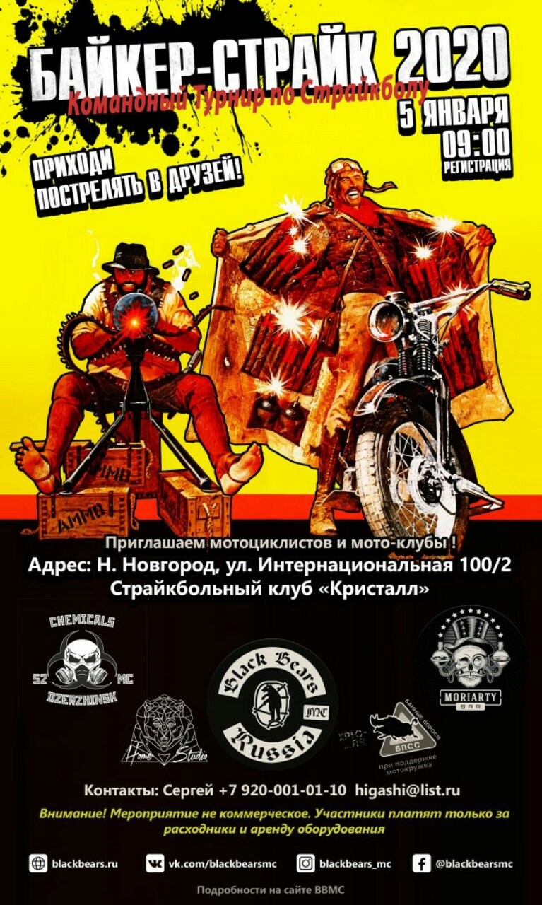 5 Января 2020г. БАЙКЕР-СТРАЙК 2020 ![]() Скачать Анкету УчастникаЦелью мероприятия являются общение и совместный активный отдых, развлечение для тела и духа, приобретение необходимых навыков для действий в команде. 1. Общая информация 1.1 Участие в Мероприятии. Участвовать могут все владельцы 2хколёсной мототехники. Кол-во бойцов в одной команде не должно превышать 5 человек. Общее кол-во участников не более 70 человек. Каждый участник по своему желанию оплачивает следующие наборы оборудования: Базовый набор участника - 800р страйкбольный привод* с одиночным огнём: винтовка/дробовик/пистолет; бесконечное кол-во шаров + Стандартная экипировка: защитная маска, одежда в стиле милитари предоставляется (по желанию) Расширенный набор – 1800р страйкбольный привод* с АВТОМАТИЧЕСКИМ огнём: пулемет; бесконечное кол-во шаров + Стандартная экипировка: защитная маска, одежда в стиле милитари предоставляется (по желанию) Граната – 200р/шт Форма одежды – любая, НО! Туловище – футболка/рубашка и т.п. Выбрать можно только один вид оружия за раунд. Кол-во пулеметов на команду за 1 раунд – 1шт. Кол-во гранат на команду за 1 раунд – 2шт. Схема игры: Играем команда на команду. Методом жеребьевки выбирается кто с кем играет вначале, далее команды-победители соревнуются между собой. Играем по 3 раунда. Длительность раунда - 15 минут либо до полного уничтожения команды противника. Если 15 минут истекли, то победитель раунда - та команда, у кого осталось больше бойцов в игре. За исполнением правил на площадке будут следить независимые судьи (в жилетах красного/оранжевого цвета). По ним НЕ стрелять! *Привод – электропневматическая копия какого-либо реально существующего оружия, стреляет пластиковыми шариками диаметром 6 мм массой от 0,12 до 0,43 г в автоматическом и одиночном режимах. Используется в основном для игры в страйкбол. Страйкбол - командная, военно-тактическая игра, с использованием «приводов» (разрешённая дульная энергия в России не более 3 Дж), использующих пластиковые шарики, не содержащие красящих пигментов (что отличает данную игру от пейнтбола). Игра ведётся на честность, до первого попадания. «Мёртвый» уходит в специально отведенное место, где ожидает конца раунда. 2. Место проведения Нижний Новгород, ул. Интернациональная 100/2, Страйкбольный клуб «Кристалл» В наличии: отапливаемая игровая площадка, различные виды вооружения, музыкальное сопровождение, 2 комнаты отдыха с телевизором и игровыми приставками. Питание – с собой либо за отдельную плату на месте проведения Мероприятия. 4. Регистрация и контакты. Подать заявку на участие можно по higashi@list.ru или 89200010110 Сергей (Джек), WhatsApp, Viber. Оплата производится предварительно на карту сбербанк 5469420014808656, или по номеру 89200010110 (при переводе указать название команды и ФИО/дорожное имя) или на месте. 5. Программа мероприятия. 5 января 09:00 – Регистрация участников; 11:00 – Общий сбор команд-участников; - Краткий курс обращения с приводом, правила страйкбольной игры. - 2 вводных раунда по 30 минут для ознакомления с игровой площадкой. Все Команды-участники делятся на 2 Стороны. Задача: уничтожить всех участников Стороны противника. 12:00 – старт Игры. 15:00-15:45 – обеденный перерыв. 18:00 - конец Игры. Вручение памятных призов от Black Bears MC Russia и спонсоров. ВНИМАНИЕ! Мероприятие не коммерческое. Участники платят только за расходники и аренду обору
